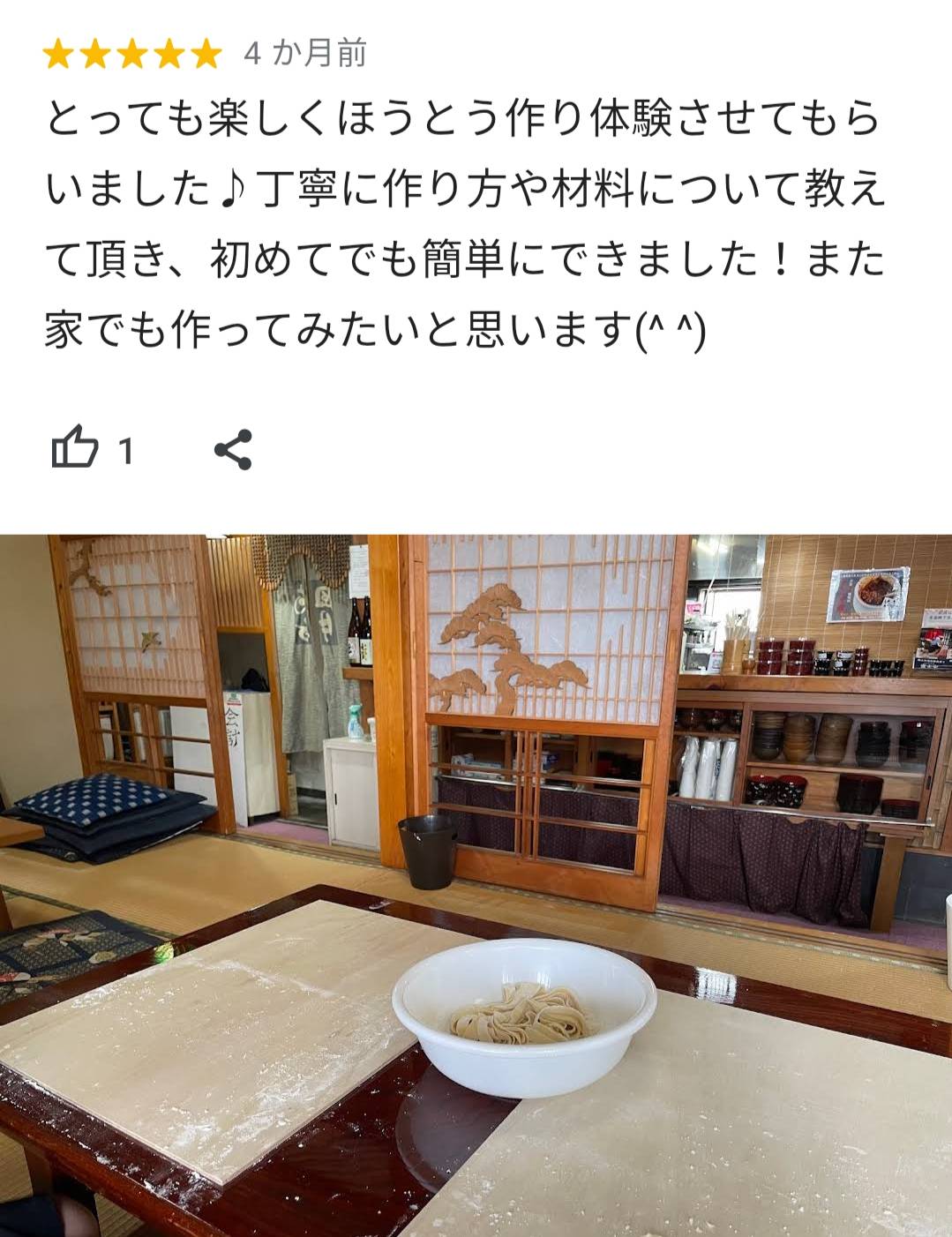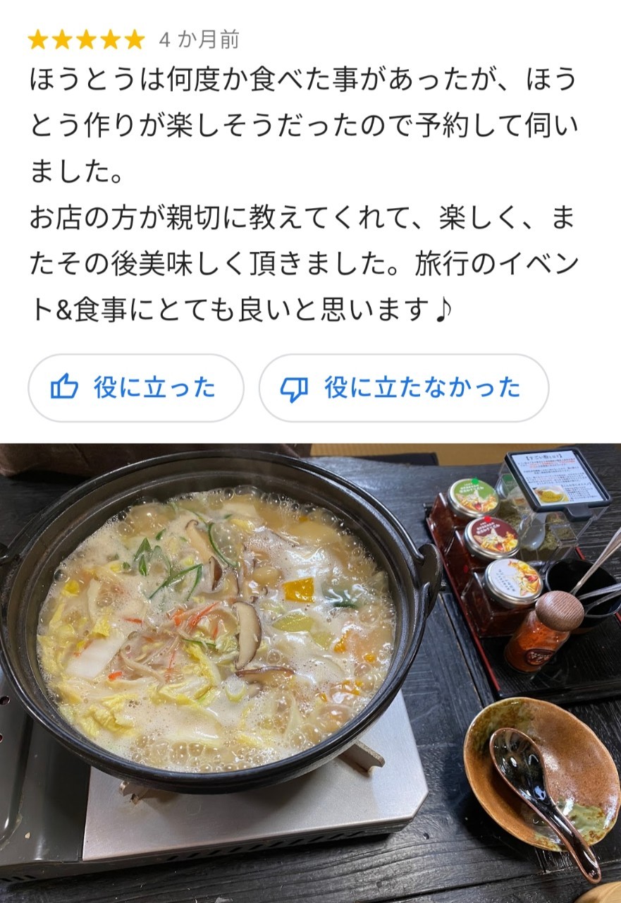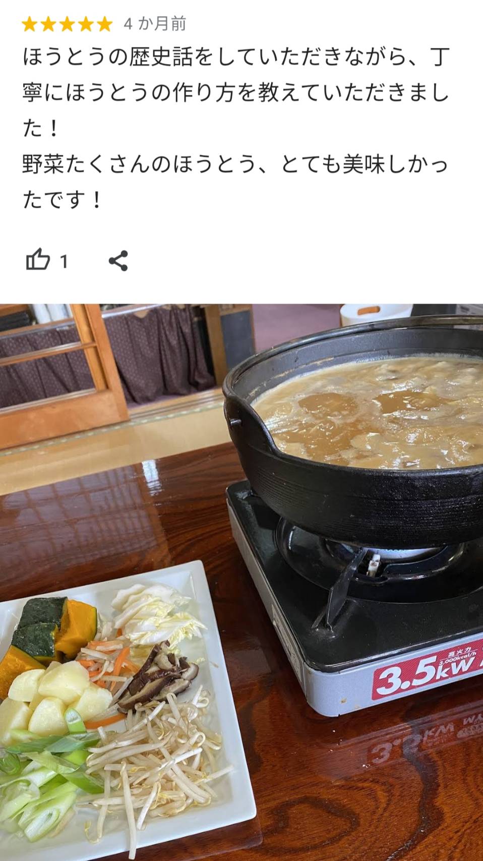 - ほうとう体験の他にも、黒蜜きな粉餅作り体験などのオプションもご用意しておりますので、ご希望でしたらお知らせください。