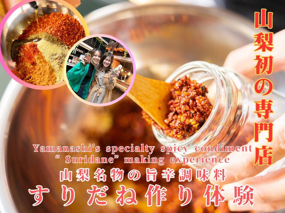 富士家では山梨名物である万能辛味調味料「すりだね」の専門店としても営業しております。すりだねは主に吉田のうどん屋さんやほうとう屋さんに必ず置いてある辛味です。通常、一種類しかないすりだねですが、富士家ではこだわりのスパイスや無添加にこだわった調味料を加えた、富士家独自のすりだねを全14種ご用意しております。ご旅行のお土産や差し入れにもぴったりです。(体験後のお食事の際に試食をお出しします。)