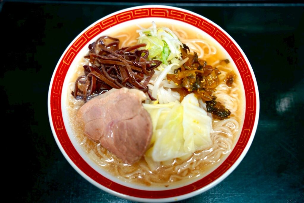 トッピングはチャーシュー・ねぎ・もやし・高菜・紅ショウガです。