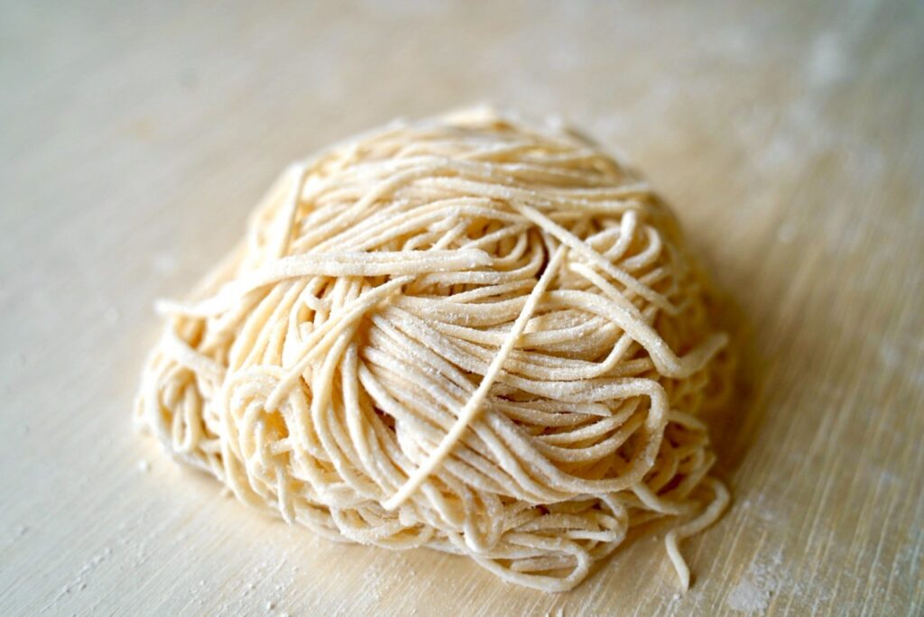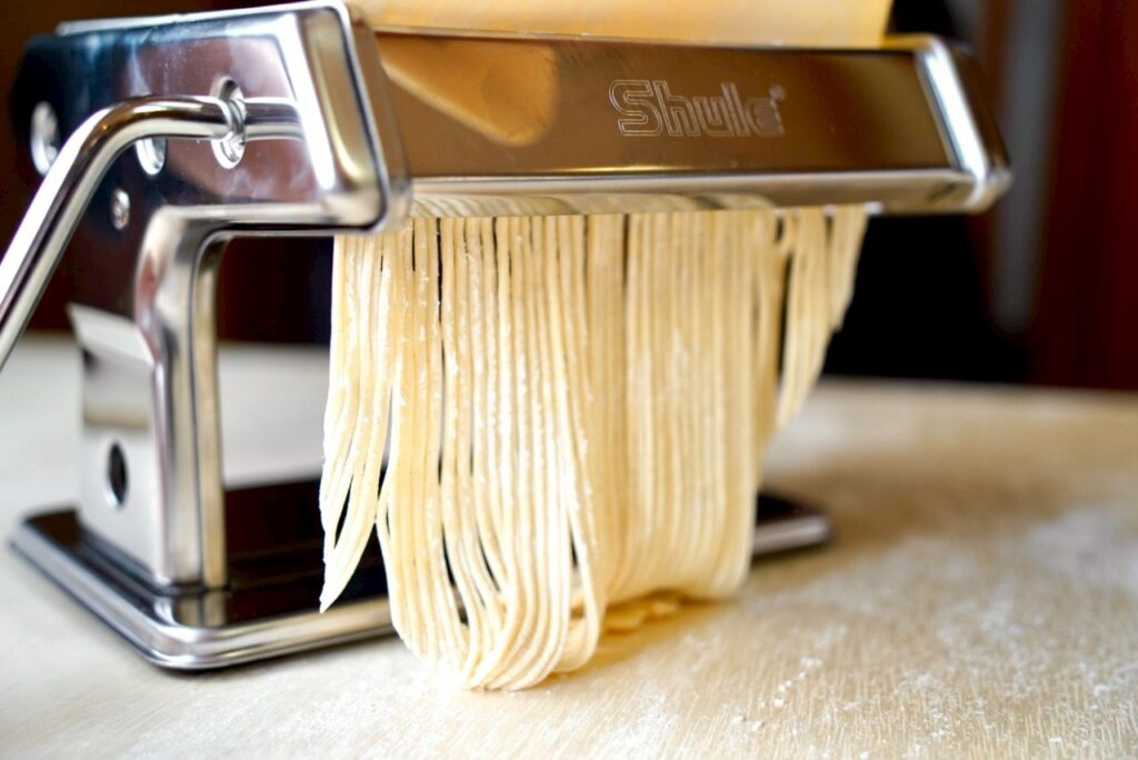 生地を延ばし終えたら、生地に打ち粉を両面に振りかけます。その後、麺きり機に生地を入れて切っていきます。完成まであと少しです。