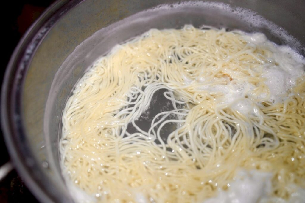 二郎系ラーメンを茹でる際はキッチンで茹でさせて頂きます。時間は10分ほど。複数人でご参加の場合は、最大3名~4名様でまとめて茹でさせて頂きます。茹で終えたら、麺とトッピング類をお客様の席に運びます。ご自由にトッピングしてください。