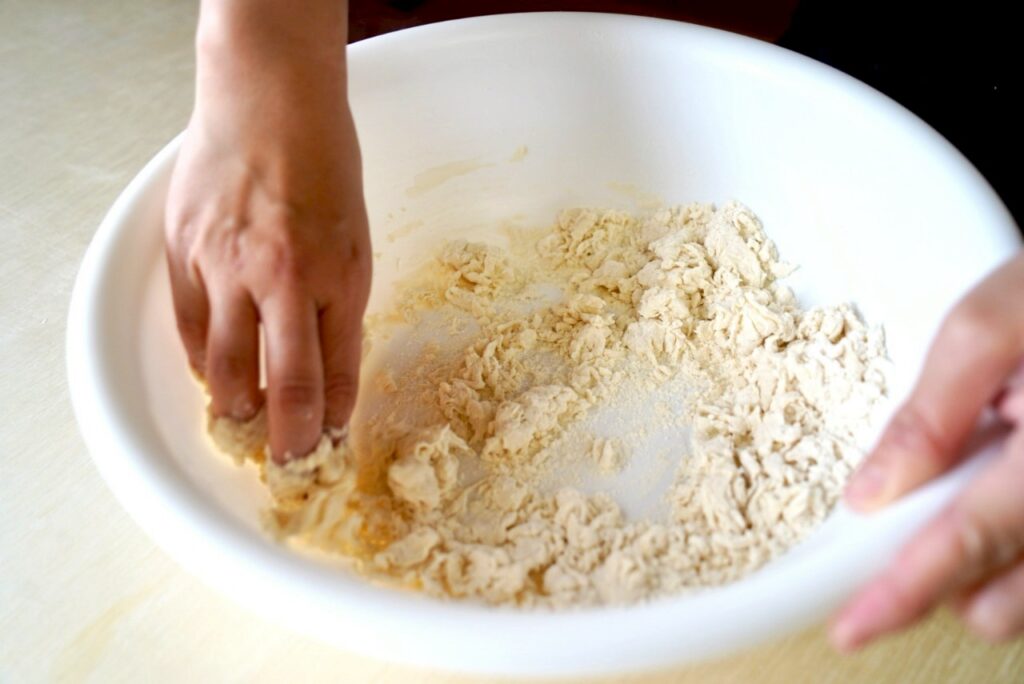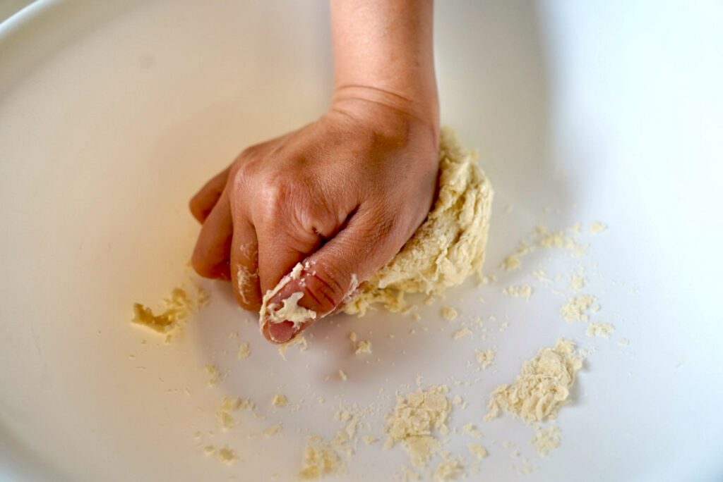 生地を捏ねる際は、手のお腹を使って体重を掛けながら一つにまとめます。生地の表面に白い粉が残っている状態ですと、捏ねが不十分です。生地の表面全体がクリーミーになるまで力強く捏ねていきます。特にお子様ですと力が足りないこともあるので大人の方と協力しながら進めましょう。