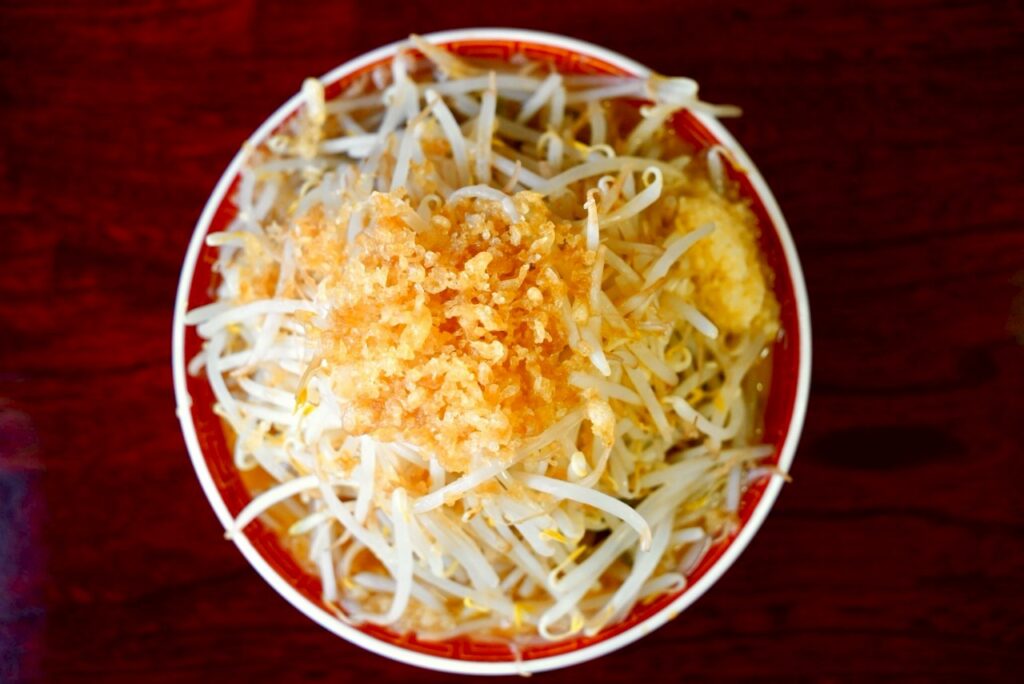 当店では二郎系には珍しい天かすをかけることもおすすめです。