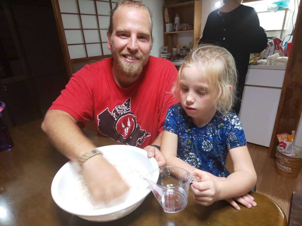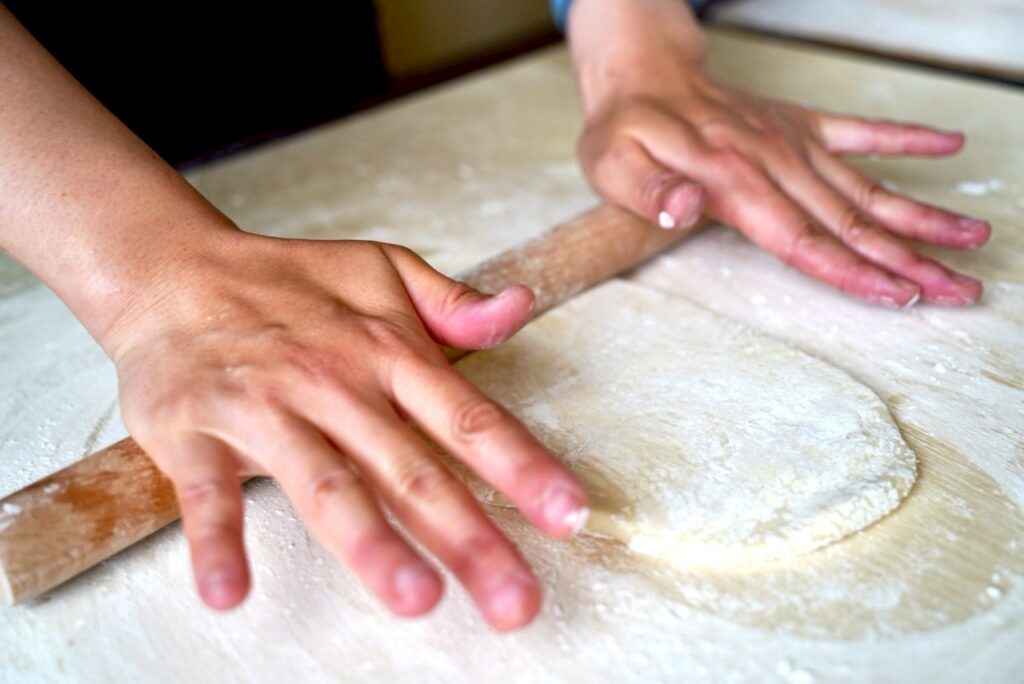 生地が完成したら生地の表面に打ち粉をふりかけます。表面が白くなったら麺棒を使って生地を薄く伸ばしていきます。