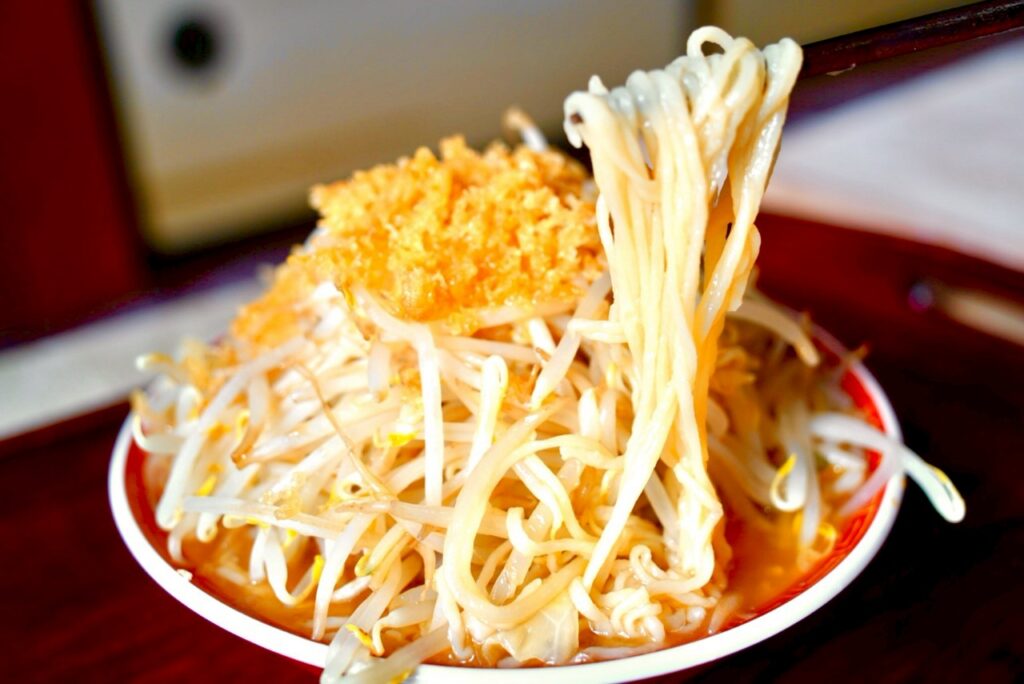 二郎系ラーメンの特徴は太麺・濃い味・山盛りでインパクト抜群といったものがあり、一度食べたら病みつきになる中毒性の高いラーメンです。